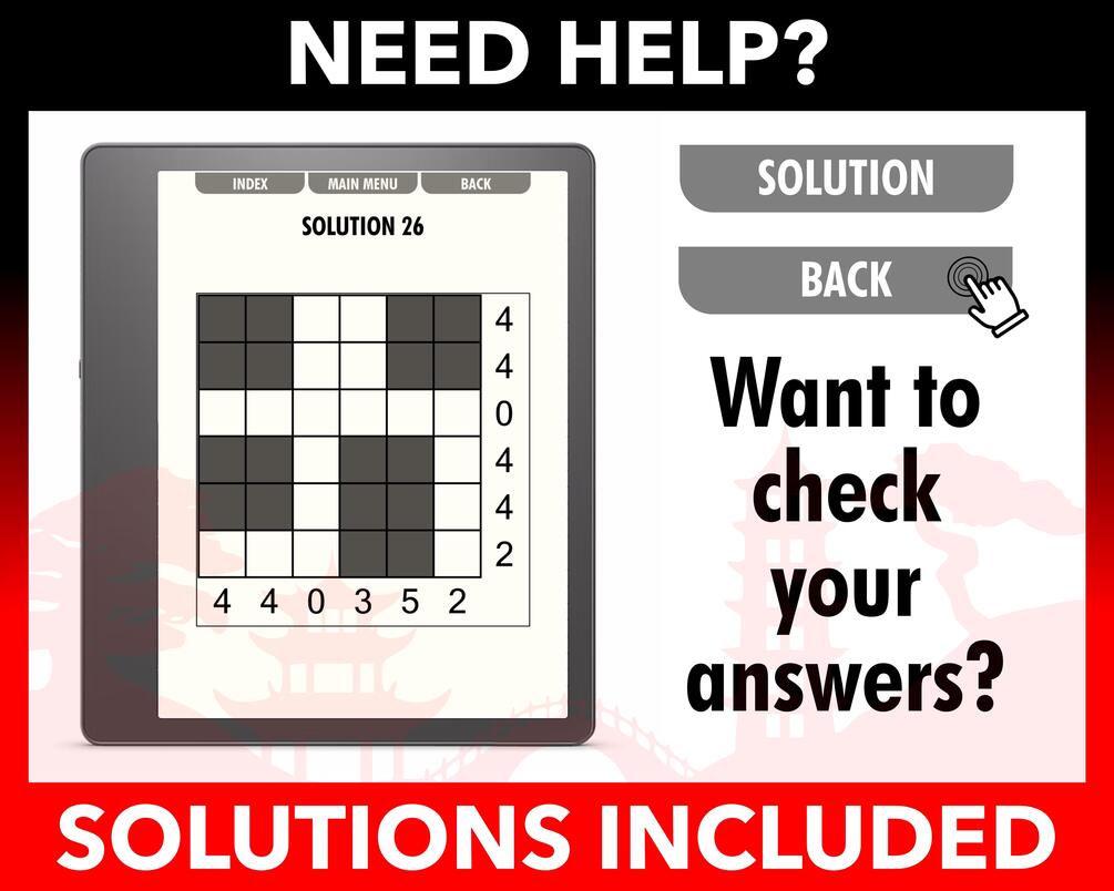 Each puzzle has matching solution file which you can use to check your answer or help if you are stuck by tapping on the SOLUTION tag on top of each puzzle page. BACK will get you back to the puzzle origin.